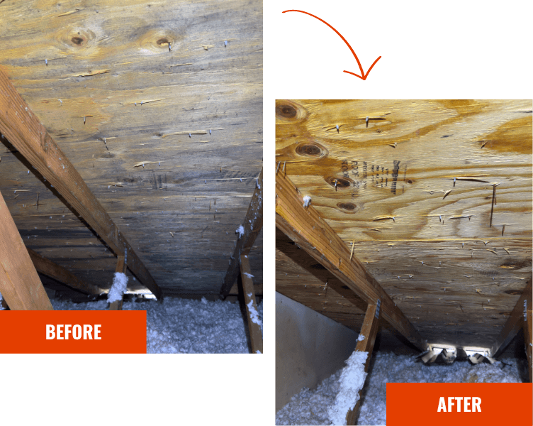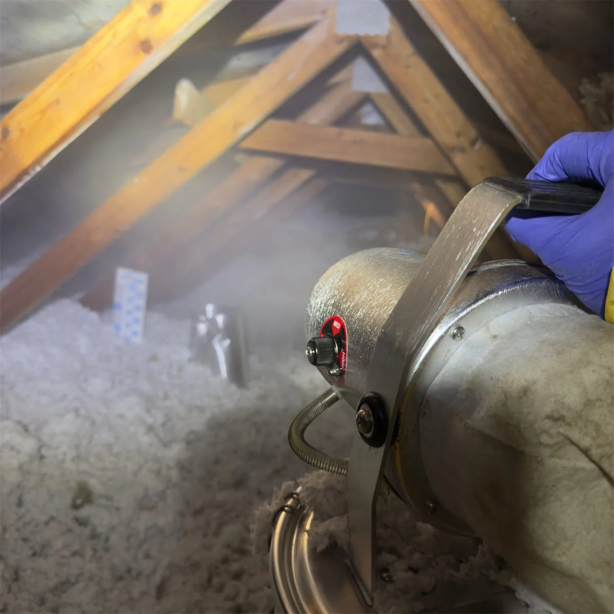 Before we touch the mold, we deal with what caused it. That usually means replacing damaged ducts and reconnecting bathroom exhaust fans so they vent outside instead of dumping moisture into your attic. Without addressing this, mold will return regardless of how thorough the surface treatment is.
