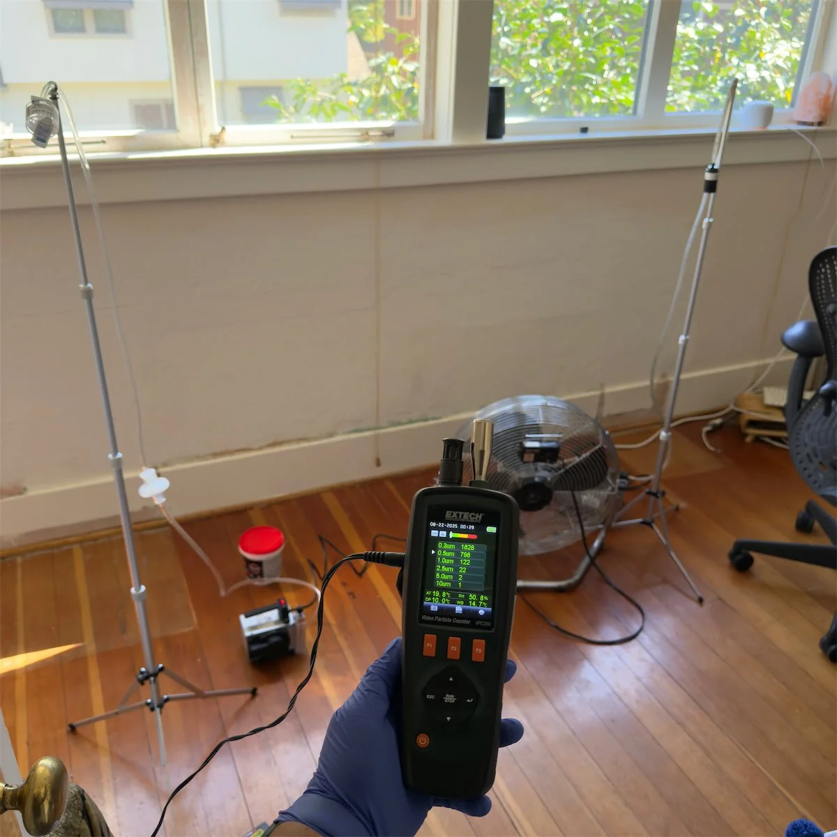adds a lab-confirmed air sample cassette. We recommend this when particle counts come back elevated and you need to know exactly what you’re breathing in. The lab identifies the specific mold species and contaminant.